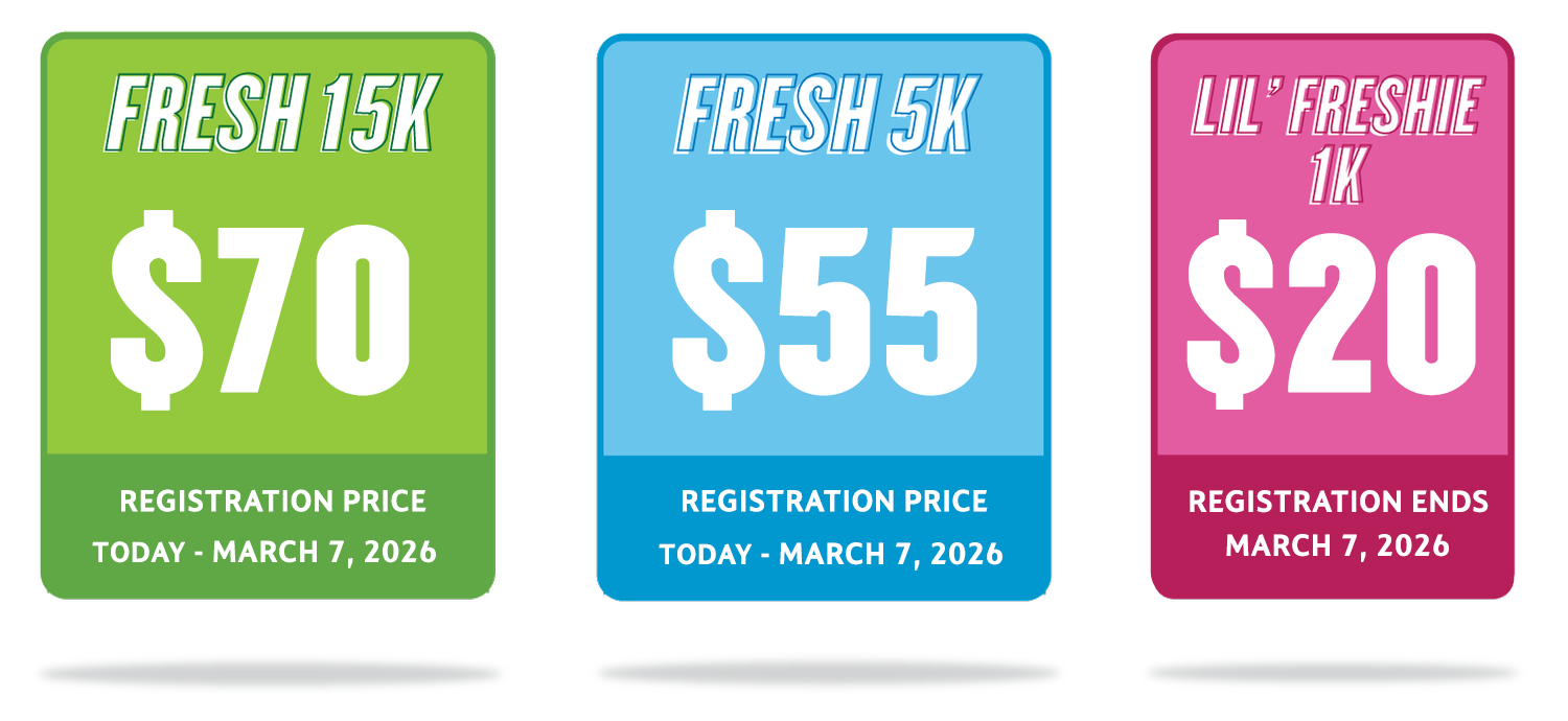 FRESH 15 is not just a race – it’s an experience. Recognized as one of the top 15Ks in the country, this premier event is a must-run for athletes of all levels. Choose from a 15K, 5K, or Kids’ 1K and enjoy an unmatched race-day atmosphere with top-tier swag, a safe and spectator-filled course, and an epic post-race celebration. Plus, 100% of race revenue is donated back to non-profit organizations within our community. Sign up today and be part of something bigger!